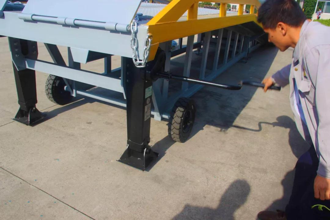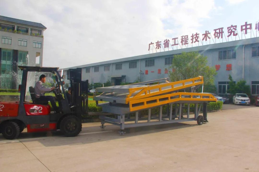 折疊式登車橋是與叉車配合使用的貨物裝卸輔助設備,在地面和車輛之間搭起橋梁,可根據汽車車廂的高低調節高度,叉車可以直接通過它駛入車廂內進行貨物的裝卸作業。