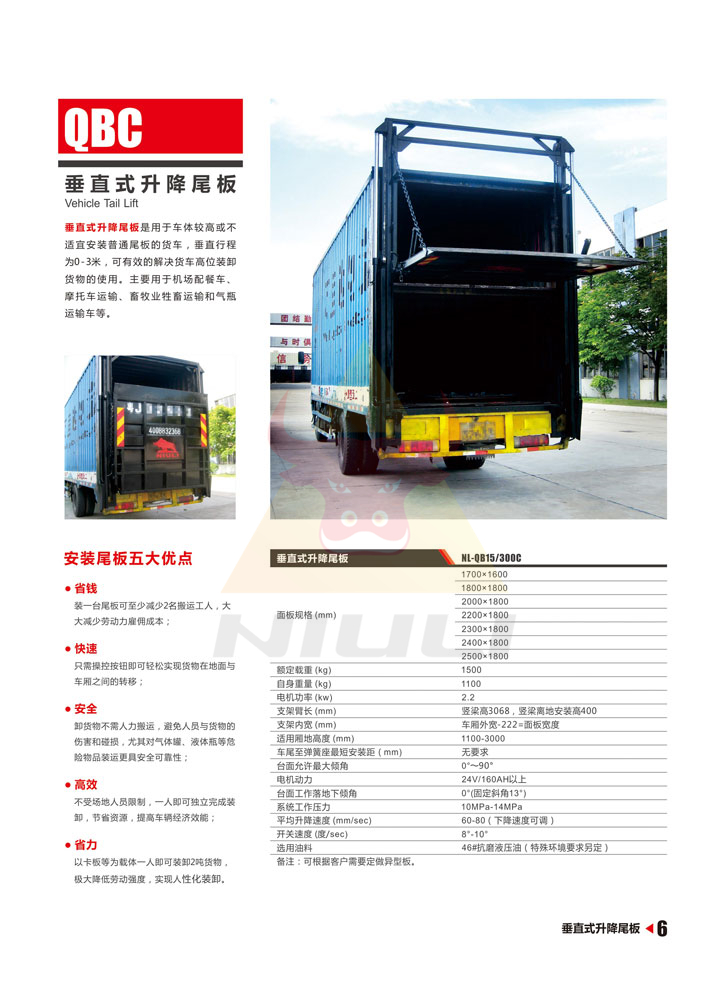 垂直式升降尾板是用于車體較高或不適宜安裝普通尾板的貨車,垂直行程為0-3米,可有效地解決貨車高位裝卸貨物的使用。主要用于集成配餐車、摩托車運輸、畜牧業牲畜運輸和氣瓶運輸車等。