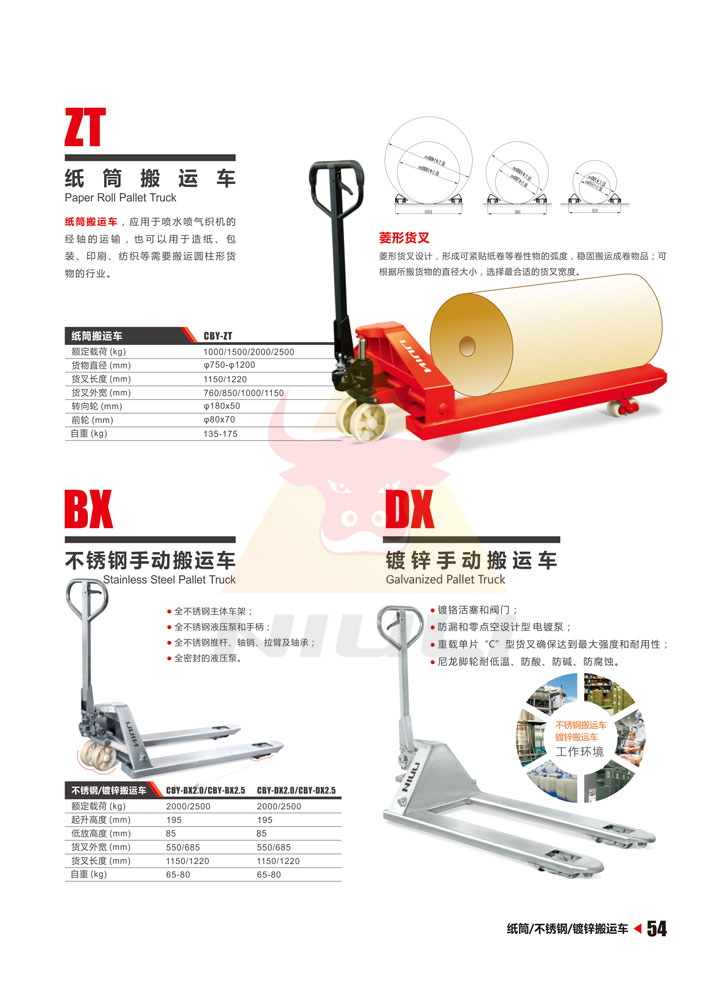 除了輪子和密封件以外所有零部件均由不銹鋼制作,如油缸、車架、手柄、推桿、軸承、插銷等;具有很強的抗腐蝕能力,適用于冷庫及潔凈度、抗腐蝕性要求比較高的場所,如肉類加工、奶制品加工、食品加工、 水產品加工等行業。