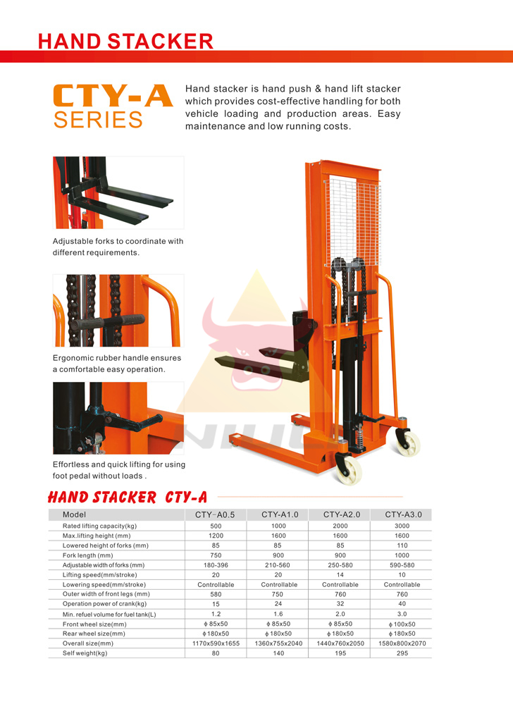 Hand stacker is hand push & hand lift stacker which provides cost-effective handling for both vehicle loading and production areas. Easy maintenance and low running costs.